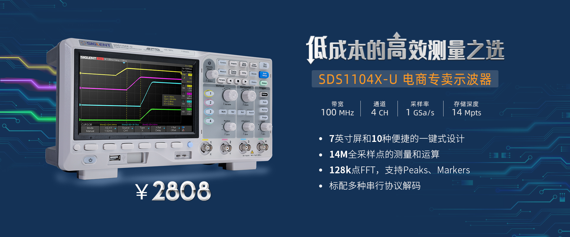作為入門級數(shù)字示波器,SDS1104X-U帶寬100 MHz,采樣率1 GSa/s,能滿足工程師大部分的信號測量需求。10種便捷化一鍵操作,38種自動測量功能,...